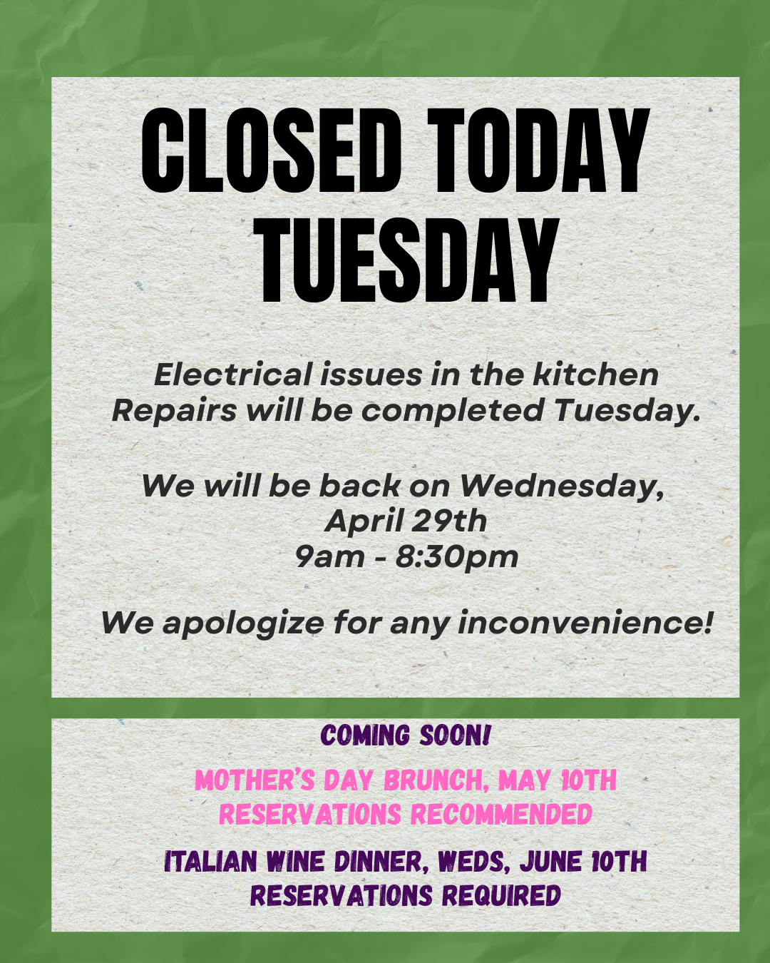Hours: Mon-Sat, 9am-8:30PM, Sunday Brunch 9am - 3PM